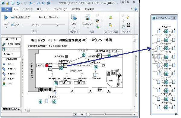 空港出発ロビーの例では、乗客がチェックインカウンタに荷物を預け、搭乗するまでの流れからモデルを作成しシミュレーションしたものです。