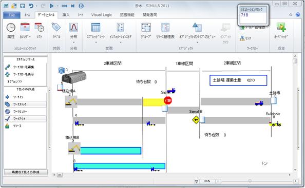 また、土木工事では、トラックの積載能力/台数、運搬ルートの車線数、信号の点滅のタイミング、車両スピードなど、きめ細かなシミュレーションが行えます。