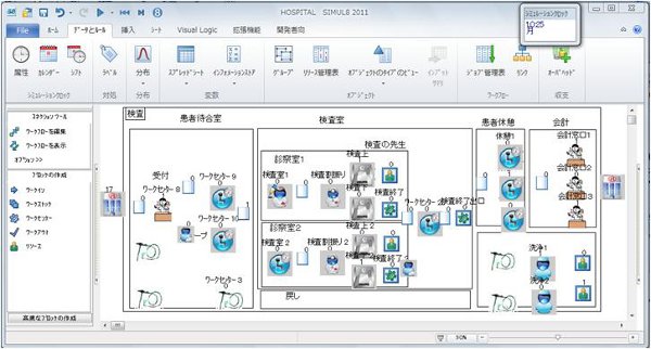 病院の待ち行列管理、医師、看護士、受付、会計などの要員管理の最適化をシミュレーションが行えます。