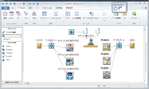 映画館の人の流れ、要員管理の最適化のシミュレーションの例。