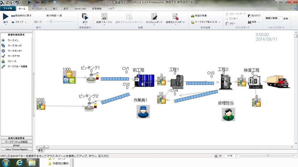 以下に、製造系の離散系シミュレーションのサンプルを示します。
