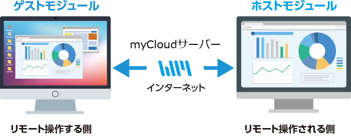 面倒なファイアウォール設定やルーターの変更なくmyCloudサーバーを経由することで、どこからでもいつでも簡単に遠隔地の端末をリモートコントロールすることができます。
